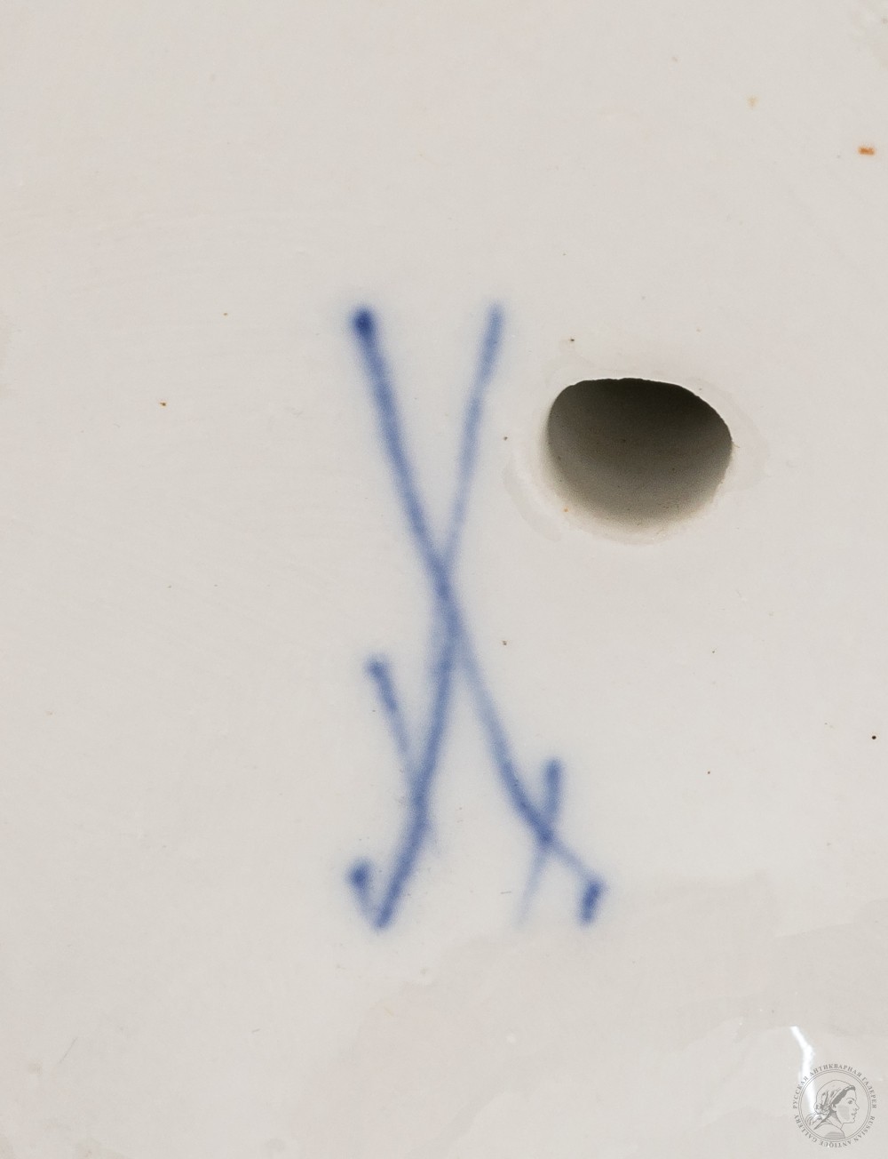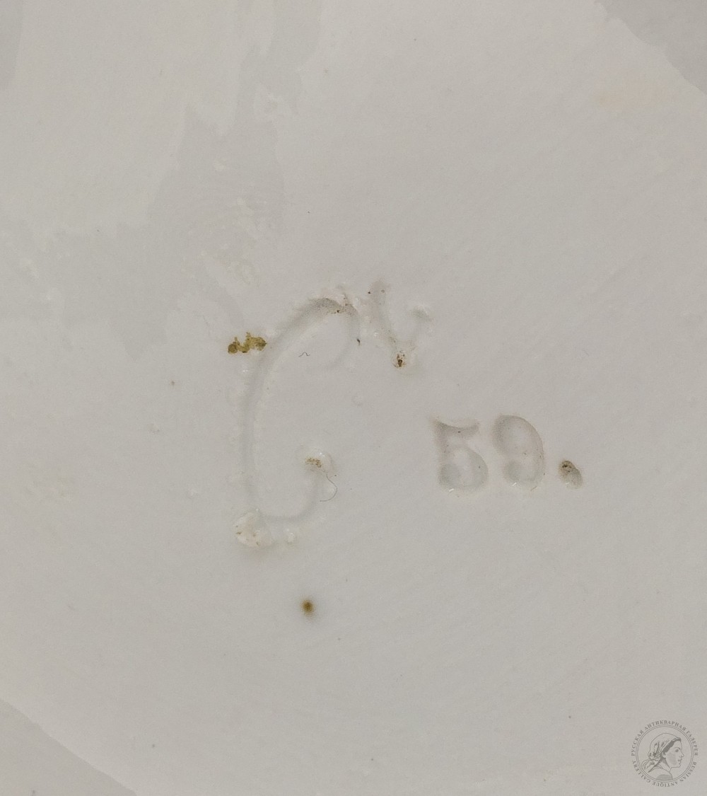 Марки: 1) фирменные «два перекрещенных меча» (кобальт, подглазурно); 2) «С» и «59» (от руки и оттиск в массе соответственно).