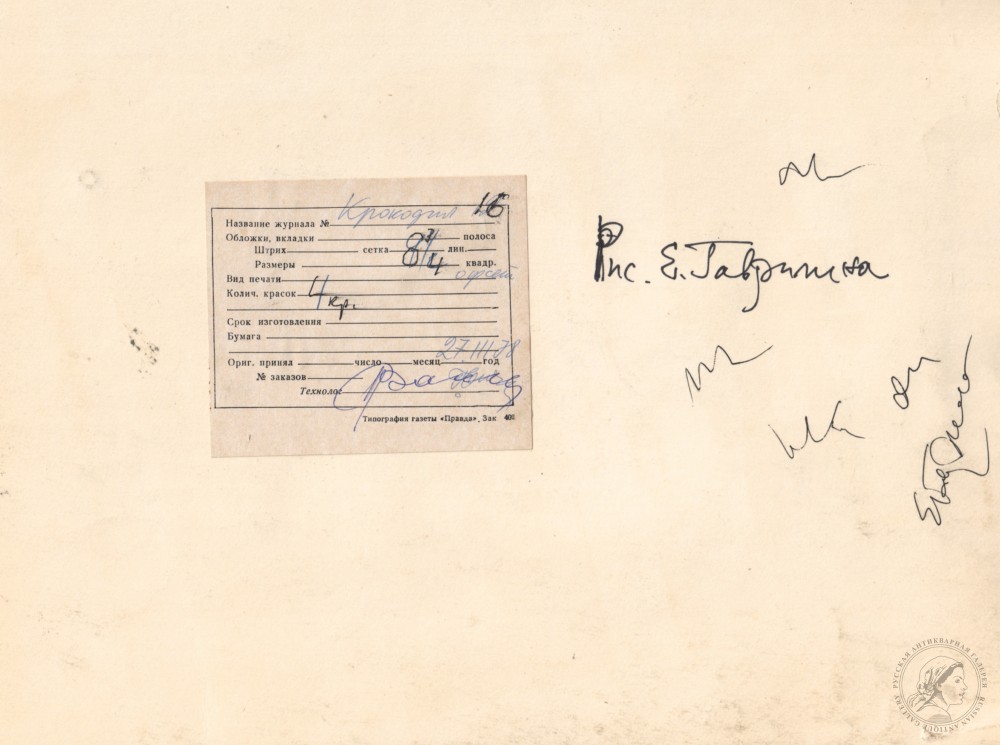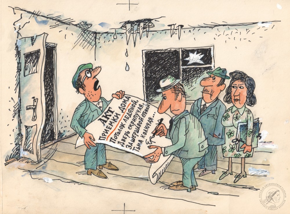 Купить карикатуру «Акт приёмки дома» для журнала «Крокодил» художника Гаврилина Е.В. вы можете в нашем антикварном интернет-магазине в Москве.