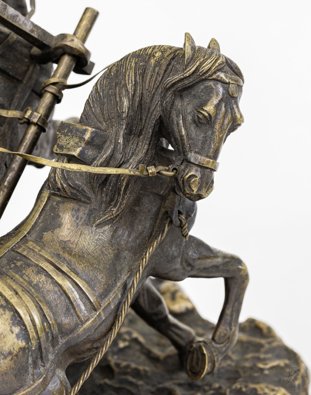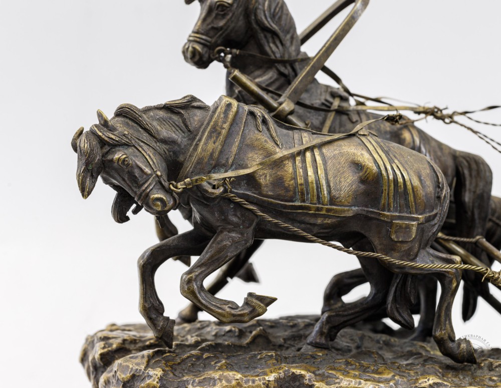 Сохранность: незначительные утраты фрагментов (колокольчик, вожжи; разрыв «постромки»), окислы, слабое крепление одной лошади.