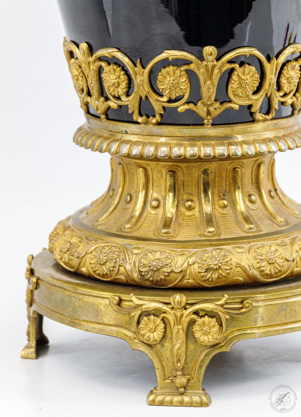 Сохранность: утраты двух бронзовых элементов декора («бутонов» около горлышка), незначительная трещина, скрытая за накладкой.