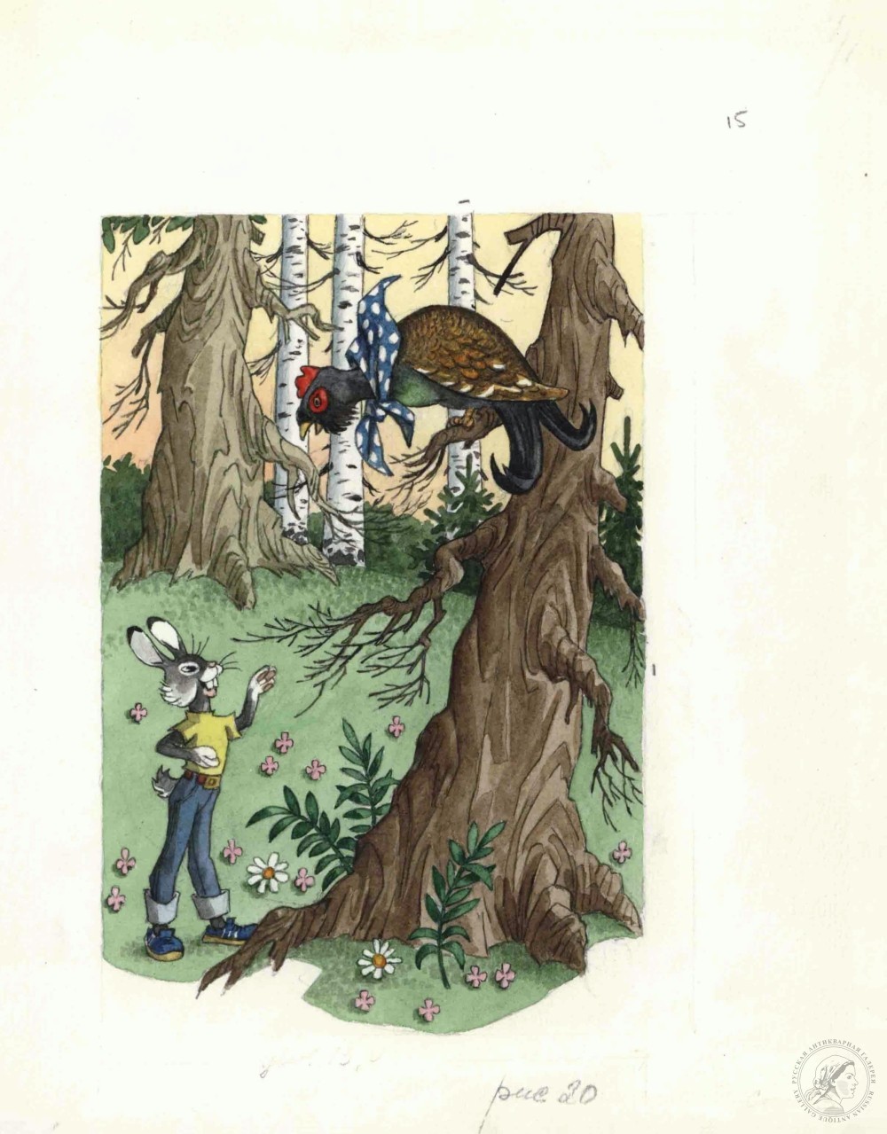 Купить иллюстрацию «Заяц и петух» к книге Грибачева «Волшебные очки» вы можете в нашем антикварном магазине в Москве
